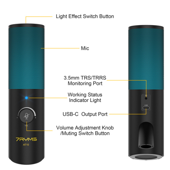 One of the standout features of the 7RYMS AT10 is its vibrant RGB lighting system. Designed to complement your gaming or streaming environment, this gaming mic with RGB lights adds a visually stunning touch while maintaining professional audio quality. The customizable lighting enhances your setup, making your content more engaging and visually appealing.