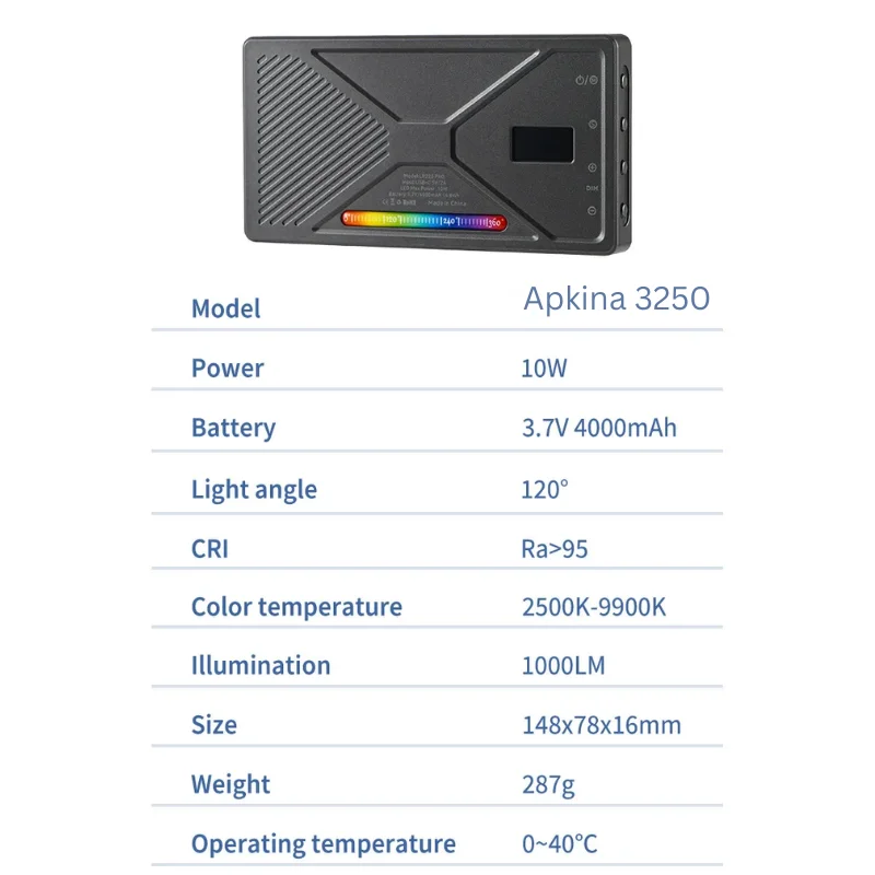 Brand: APKINAApkina AP-3250 RGB LED Fill Light delivers adjustable color lighting for vlogging, video recording, photography, and live streaming.