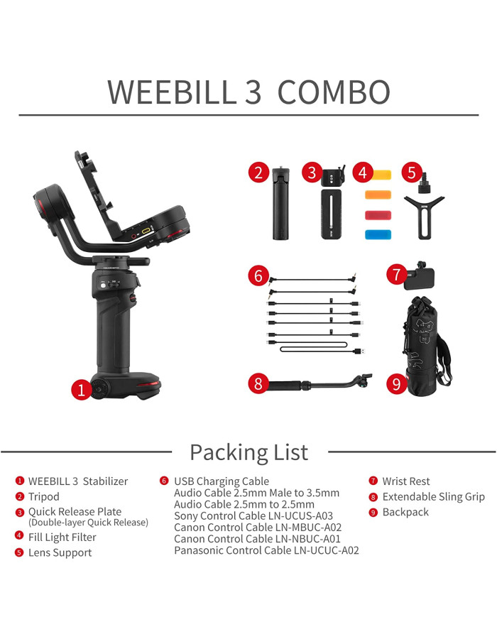 Featuring a compact and ergonomic sling-style design, the WEEBILL 3S offers improved balance and comfortable handling during long shooting sessions. The Combo version includes essential accessories for enhanced control and creative flexibility, making it ideal for professional video production.